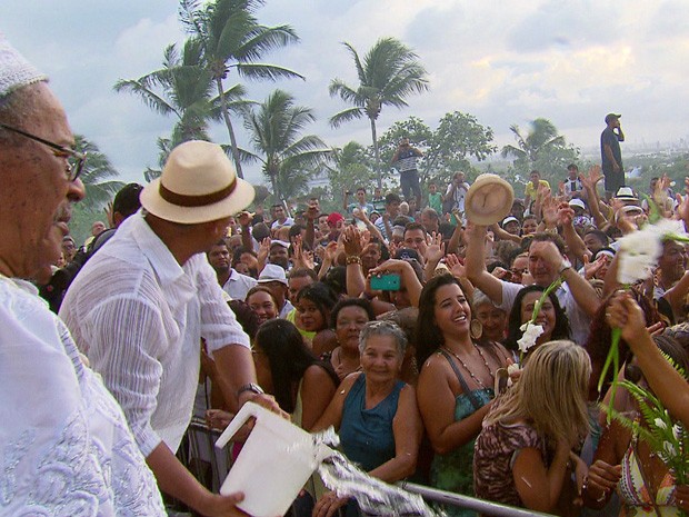 Multidão compareceu ao Alto da Sé para cerimônia (Foto: Reprodução / TV Globo)A cerimônia, que reúne ao mesmo tempo elementos da religião afro e do catolicismo, acontece sempre no primeiro domingo após o Dia de Reis, pedindo proteção para o ano que se inicia. Essa é 33ª edição da cerimônia, que costumava acontecer em frente à Igreja do Bonfim, fechada para reformas. "É o momento de pedirmos luz, paz", explica o babalorixá.
