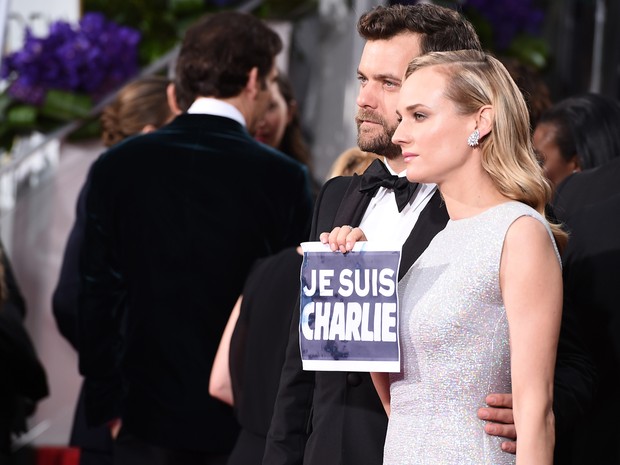 Joshua Jackson e atriz Diane Kruger mostram cartaz 'Je suis Charlie',