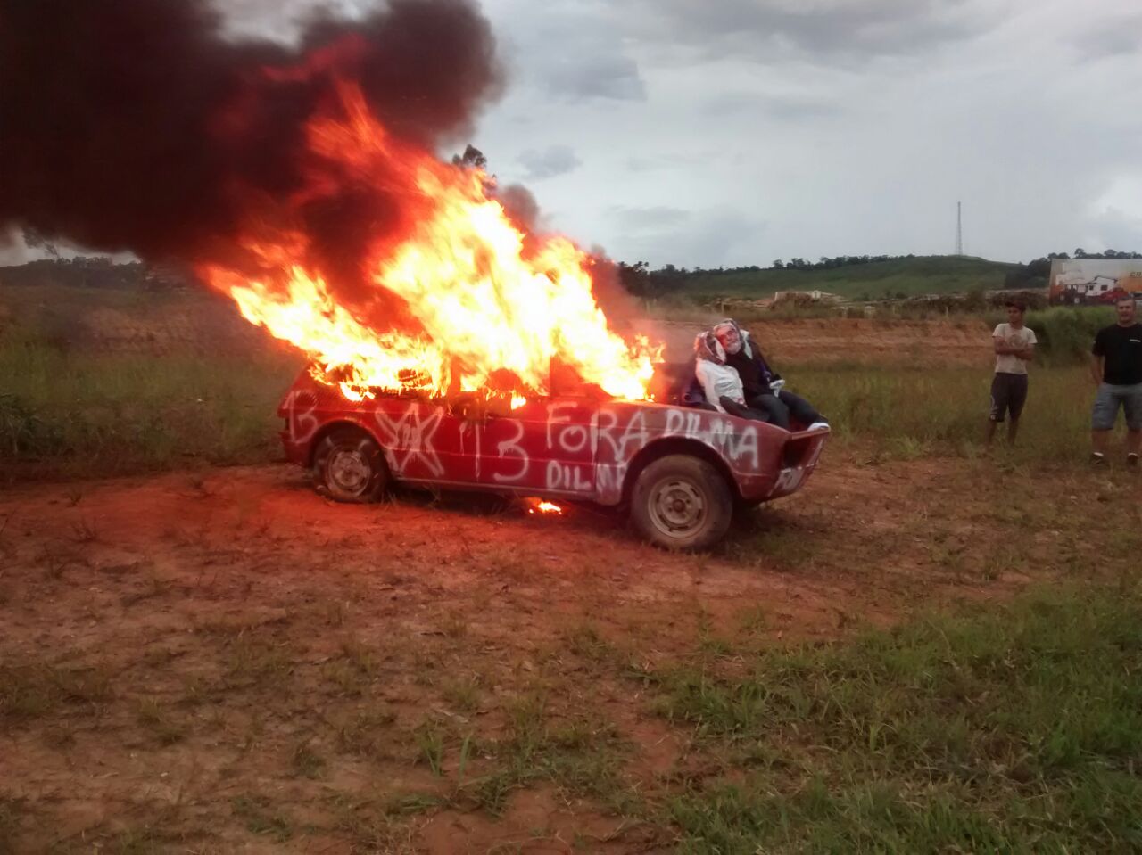 Manifestantes colocaram fogo em uma Brasília comprada em um ferro-velho em Pouso Redondo. Foto: Michel Oliveira/Divulgação