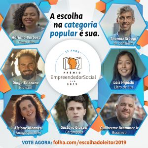 São Paulo, 14 de outubro de 2019 – Os internautas têm até 1º de novembro para acessar o site da Folha e escolher o vencedor da categoria Escolha do Leitor, que integra o Prêmio Empreendedor Social. A 15ª edição da premiação tem como finalistas inovações sociais como plataforma para desenvolver o potencial de empreendedores negros; metodologia para reciclagem que envolve academia, indústria e catadores; estação pluviométrica de baixo custo para salvar vidas; modelo de desenvolvimento social sustentável; e uso de tecnologia para levar eficiência e baixar os custos no atendimento de saúde. O público pode escolher entre Alcione Albanesi (Amigos do Bem); Guilherme Brammer Junior (Boomera); Thomaz Sroug (Dr. Consulta); Diogo Tolezano (Pluvi.On); Gustavo Glasser (Carambola); Adriana Barbosa (Preta Hub); e Laís Higashi (Litro de Luz).Para conquistar o voto dos internautas, os concorrentes contam as próprias histórias de impacto social, em vídeos de um minuto, no site do jornal, página Empreendedor Social. Pelo quarto ano consecutivo, a votação – que contou com recorde de participação em 2018 – tem o patrocínio da Fundação Banco do Brasil. “A categoria Escolha do Leitor, de voto popular, é uma ferramenta democrática que traduz a opinião das pessoas e sinaliza as soluções mais inovadoras para ajudar a resolver problemas sociais”, afirma Asclepius Soares, presidente da Fundação Banco do Brasil.
