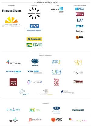 A 15ª edição brasileira do Prêmio Empreendedor Social tem patrocínio de Coca-Cola, IEL, uma iniciativa da CNI (Confederação Nacional da Indústria), e Fundação Banco do Brasil. Conta com apoio do Instituto Porto Seguro. British Council, Faap, Fundação Dom Cabral; Insper e UOL são parceiros estratégicos.