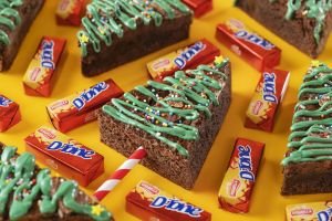 - Unte a forma com manteiga e farinha de trigo. Coloque metade da massa do brownie e disponha parte dos D-tones. Cubra com o restante da massa e finalize com o restante dos D-tones.