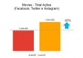 Outro fato é que as estreias dos novos filmes têm gerado um aumento no volume de ações nas contas sociais da categoria Movies. O gráfico abaixo nos dá uma ideia da mudança de comportamento da categoria em outubro 2020, que foi quando houve a abertura dos cinemas no Sudeste, para novembro 2020. O total de ações equivale a somatória do total de reações, comentários, shares, retweets e likes que cada post/tweet recebe em uma determinada rede social (aqui estamos observando Facebook, Twitter e Instagram).