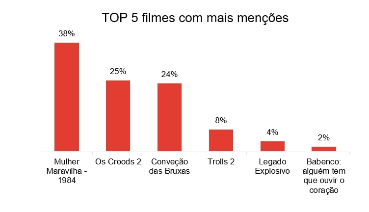 Ao fazer um listening nas redes sociais, percebemos que entre os filmes que estrearam ou que estão para estrear, Mulher Maravilha 1984 é o mais citado com 38% das menções, Os Croods 2 estão em segundo lugar com 25%, Convenção das Bruxas tem 24% das citações, Trolls 2 está no TOP 4 das citações e Legado Explosivo no TOP 5.