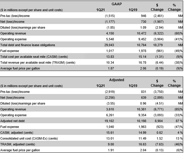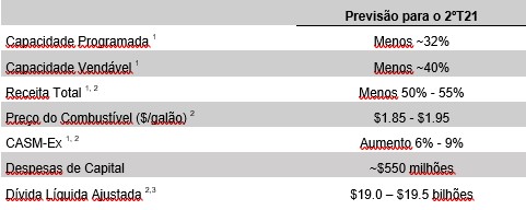 No final do referido trimestre, a empresa tinha dívida total e obrigações de arrendamento financeiro de US$ 29 bilhões, com uma dívida líquida ajustada de US$ 19,1 bilhões, o que significa US$ 8,6 bilhões a mais do que em dezembro de 2019. A dívida total da companhia tinha uma taxa de juros média ponderada de 4,5 por cento ao fim do trimestre de março. No decorrer dos três primeiros meses de 2021, a empresa pagou antecipadamente seu empréstimo a prazo de US$ 1,5 bilhão em slots, portões de embarque e rotas. E, ao final do trimestre que se encerrará em junho, espera-se que o total da dívida e do financiamento de pensões pagos desde o final do terceiro trimestre de 2020 chegue a quase