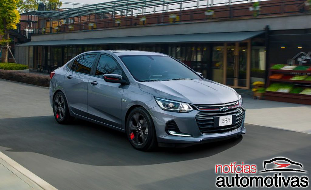 Importado da China, o Onix 2023 adiciona friso vermelho na grade preta, assim como logotipo escurecido da Chevrolet, tendo ainda retrovisores em preto brilhante com filetes vermelhos.