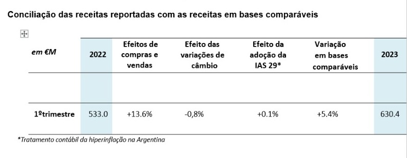 1º trimestre de 2023 com receita de 630.4 milhões de euros, aumento de 18,3% e de 5.4%, em bases comparáveis.