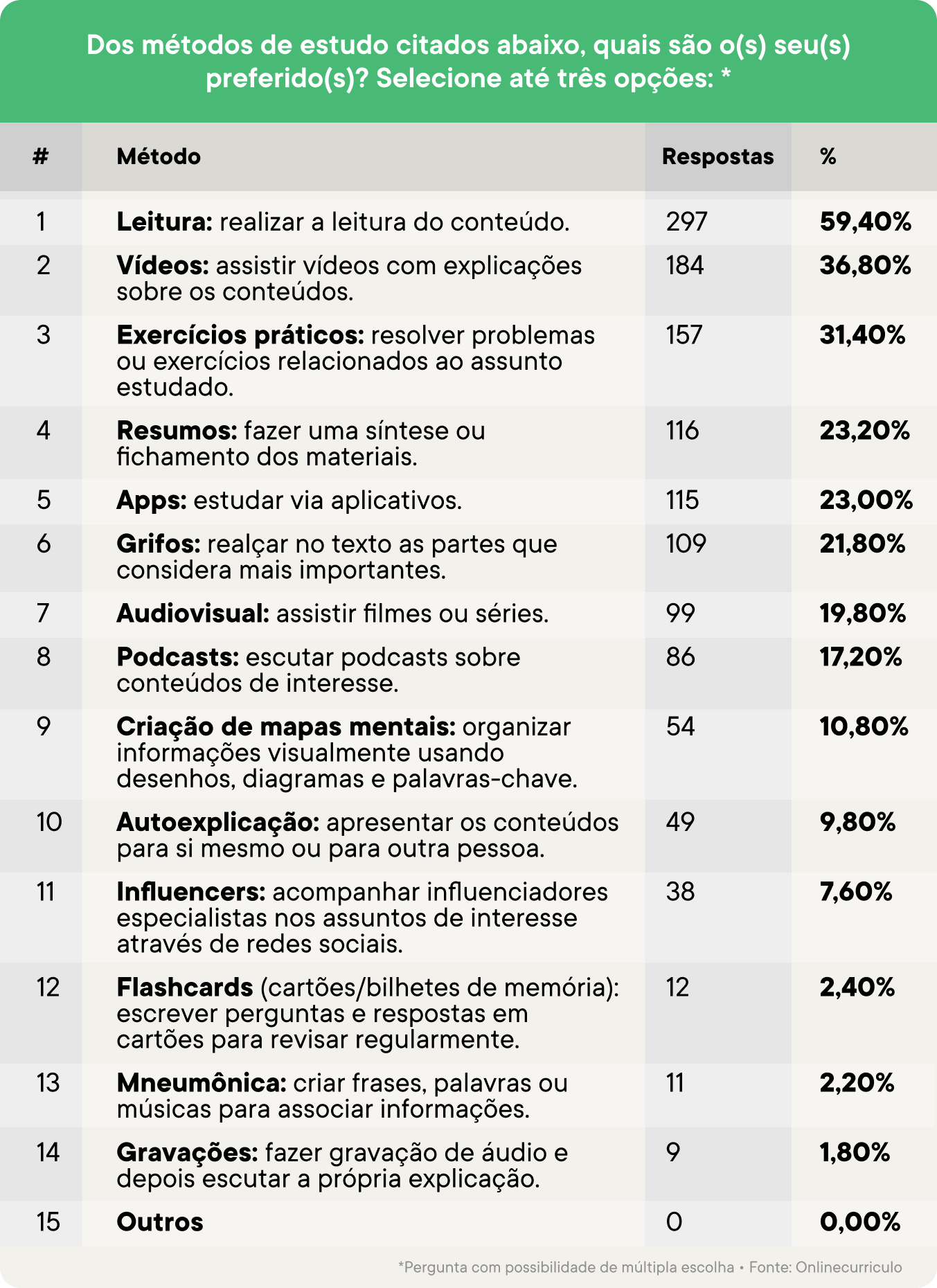 Quanto à forma de estudo preferida dos brasileiros, a leitura do conteúdo a ser apreendido apareceu em disparada como a mais utilizada, sendo indicada por 59% dos entrevistados. Na sequência, aparecem a prática de assistir vídeos com explicação do tema, escolhida por 39% dos respondentes, e a resolução de exercícios práticos relacionados ao assunto estudado, com 31% de preferência.