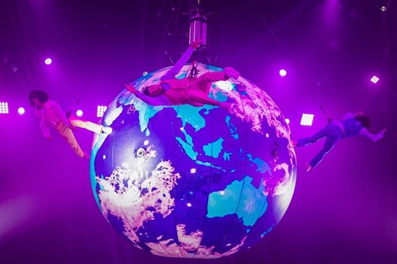 música, dança, números aéreos e atuação em um ambiente festivo, feliz e