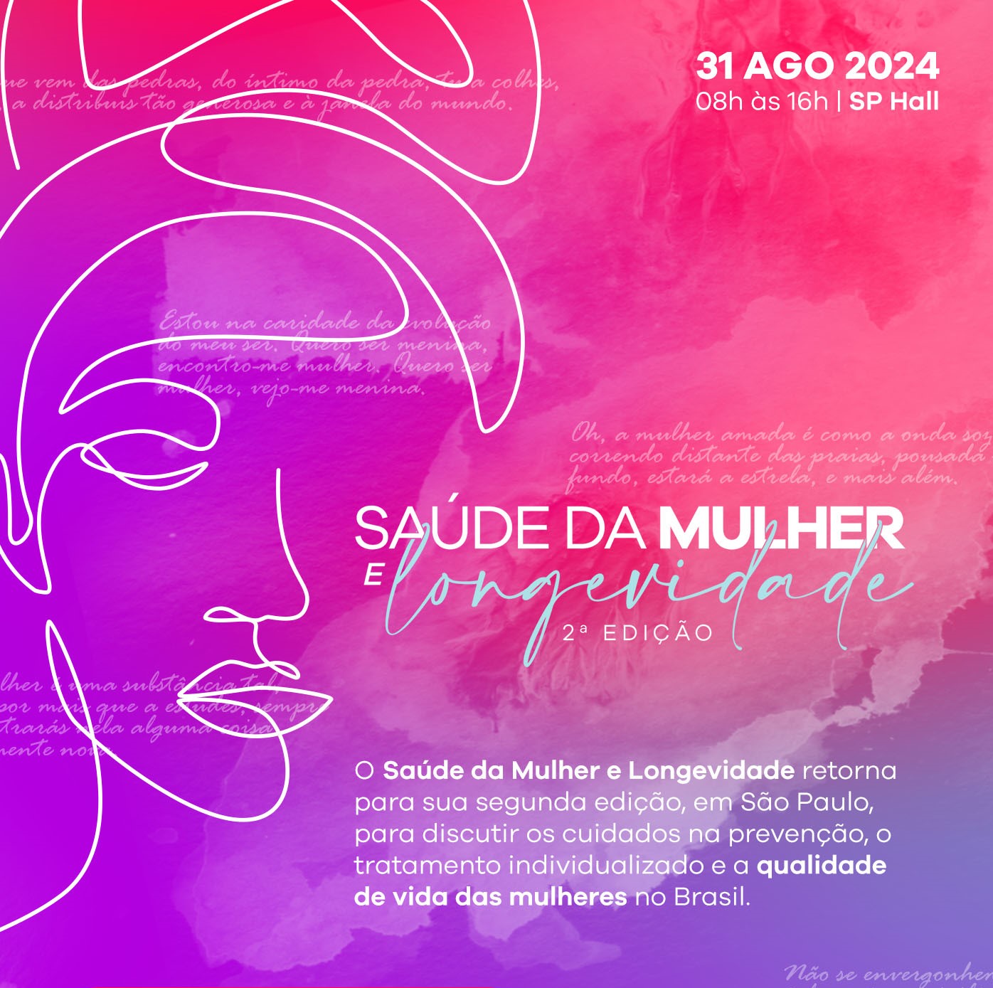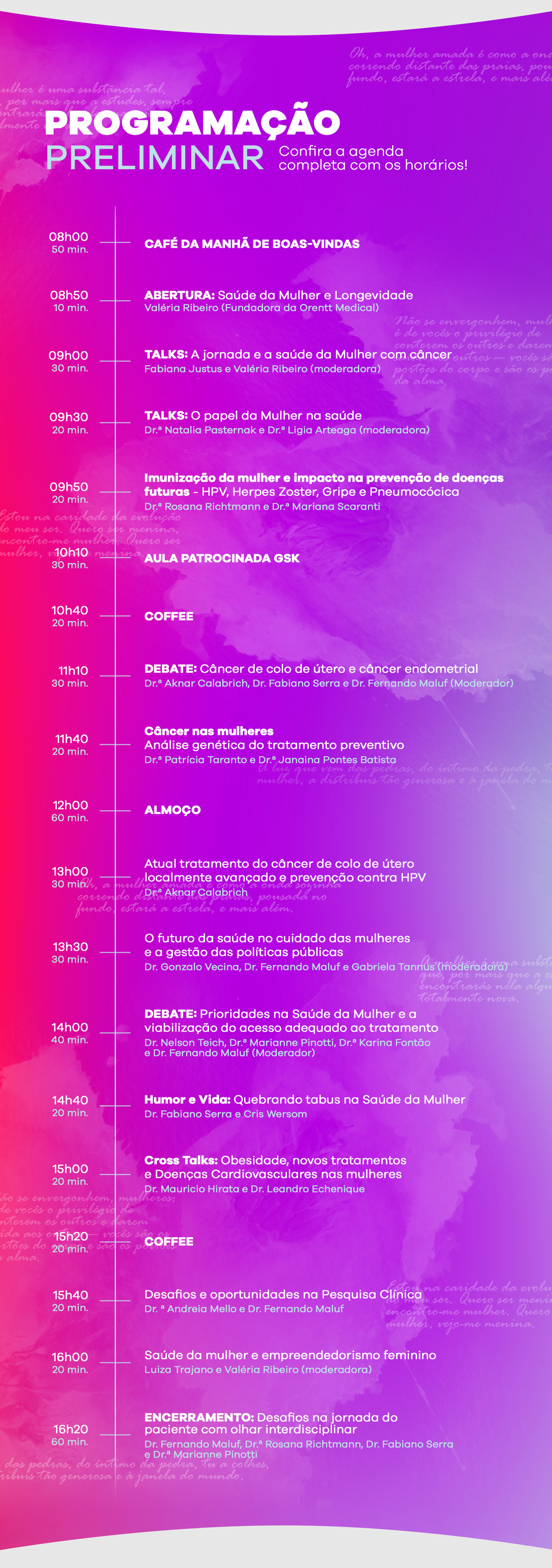 SERVIÇO – SAÚDE DA MULHER E LONGEVIDADE – 2ª EDIÇÃO DATA: 31/08/2024 (SÁBADO) LOCAL: SP HALL – AV. PRESIDENTE JUSCELINO KUBITSCHECK, 1909 HORÁRIO: DAS 8H ÀS 17h CREDENCIAMENTO DE IMPRENSA PARA COBERTURA DO EVENTO E/OU PALESTRAS | ENTREVISTAS *** Enviar solicitação prévia c/ nome e veículo para comunicacao@orentt.com.br ou whatsapp 11 93021-6482 até o dia 30/08. | |