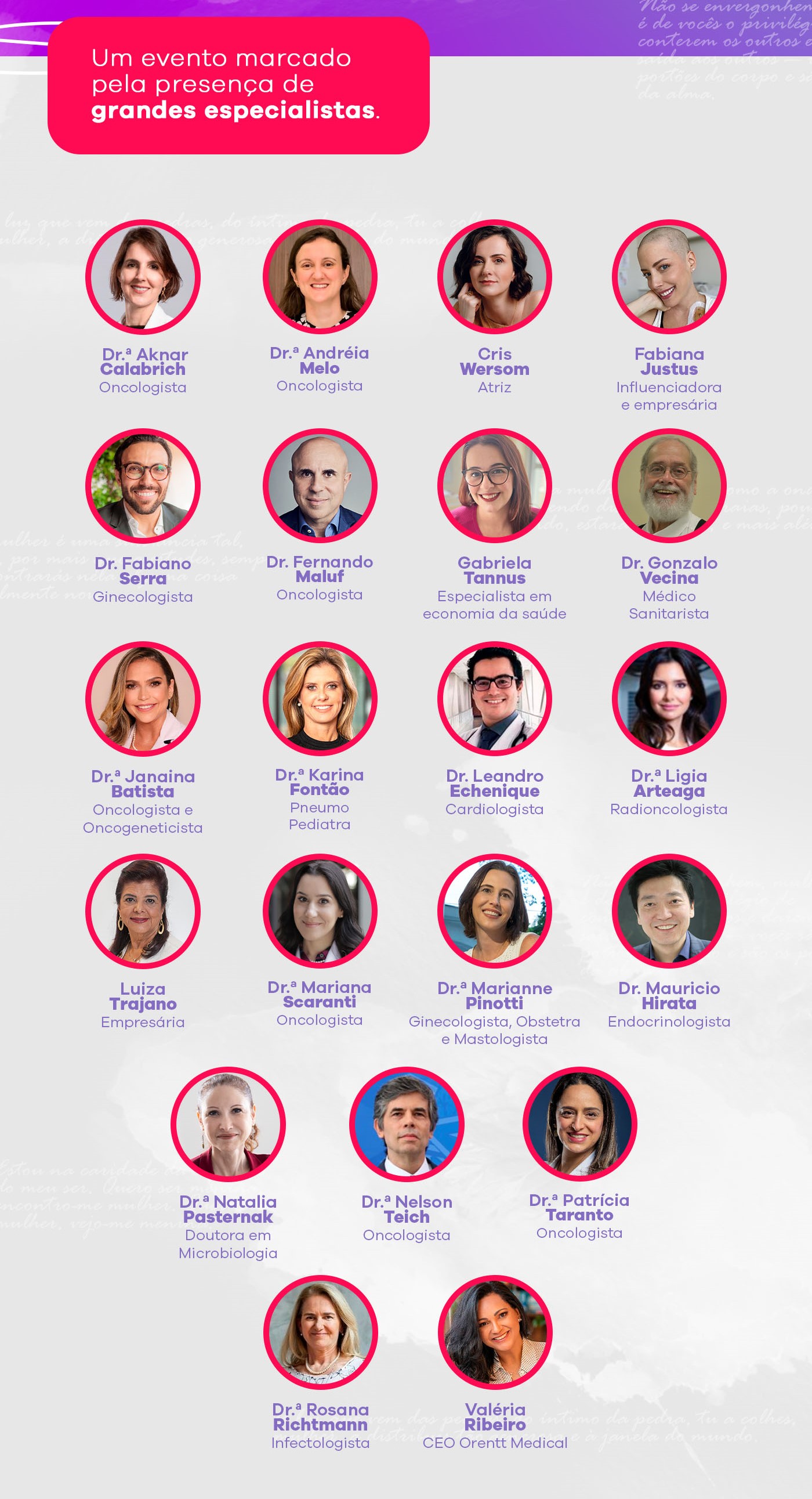Destaques – A abertura e a última palestra do encontro ficam por conta dos depoimentos da influenciadora Fabiana Justus, que vai falar sobre a jornada da paciente com câncer, e da empresária Luiza Trajano, presidente do conselho de administração da rede Magazine Luiza, que vai abordar o empreendedorismo feminino. Ambas contam com a moderação de Valéria Ribeiro, CEO da Orentt Medical. Com oito horas de duração, o encontro científico, que é dedicado a médicos e profissionais relacionados à saúde, vai trazer ao todo cinco talks/debates que envolvem os temas: o papel da mulher na saúde, tumores ginecológicos, prioridades na saúde da mulher e a viabilização do acesso adequado ao tratamento, além de obesidade e doenças cardiovasculares nas mulheres. “Teremos também sete palestras com momentos importantes para falar de análise genética do tratamento preventivo; de imunização da mulher e o impacto na prevenção de doenças futuras como Zoster, HPV, Pneumocócica etc.; do futuro da saúde no cuidado das mulheres e a gestão das políticas públicas; sobre como trazer o humor para quebrar tabus na saúde da mulher; e dos desafios e oportunidades na pesquisa clínica”, comenta a CEO da Orentt Medical, Valéria Ribeiro. O encerramento vai discutir os desafios na jornada do paciente com olhar interdisciplinar com a participação dos especialistas dr. Fernando Maluf, dra. Rosana Richtmann, dr. Fabiano Serra e dra. Marianne Pinotti. “A segunda edição do Saúde da Mulher e Longevidade segue a proposta de compartilhar novos conteúdos científicos exclusivos sobre o tema, e sempre com a participação dos melhores nomes da medicina do país”, finaliza Valéria Ribeiro. Inscrições – Para saber mais sobre o Saúde da Mulher e Longevidade – 2ª edição, acesse @saudedamulher.orentt ou @orentt_medical nas redes sociais. | |