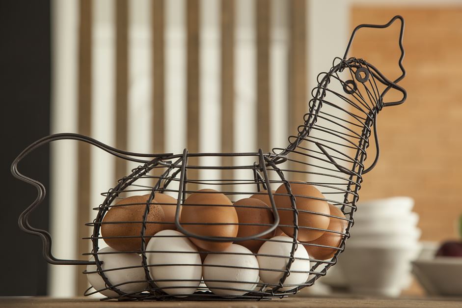 cesto na forma de galinha, que acomoda os ovos da casa, é um tipo de