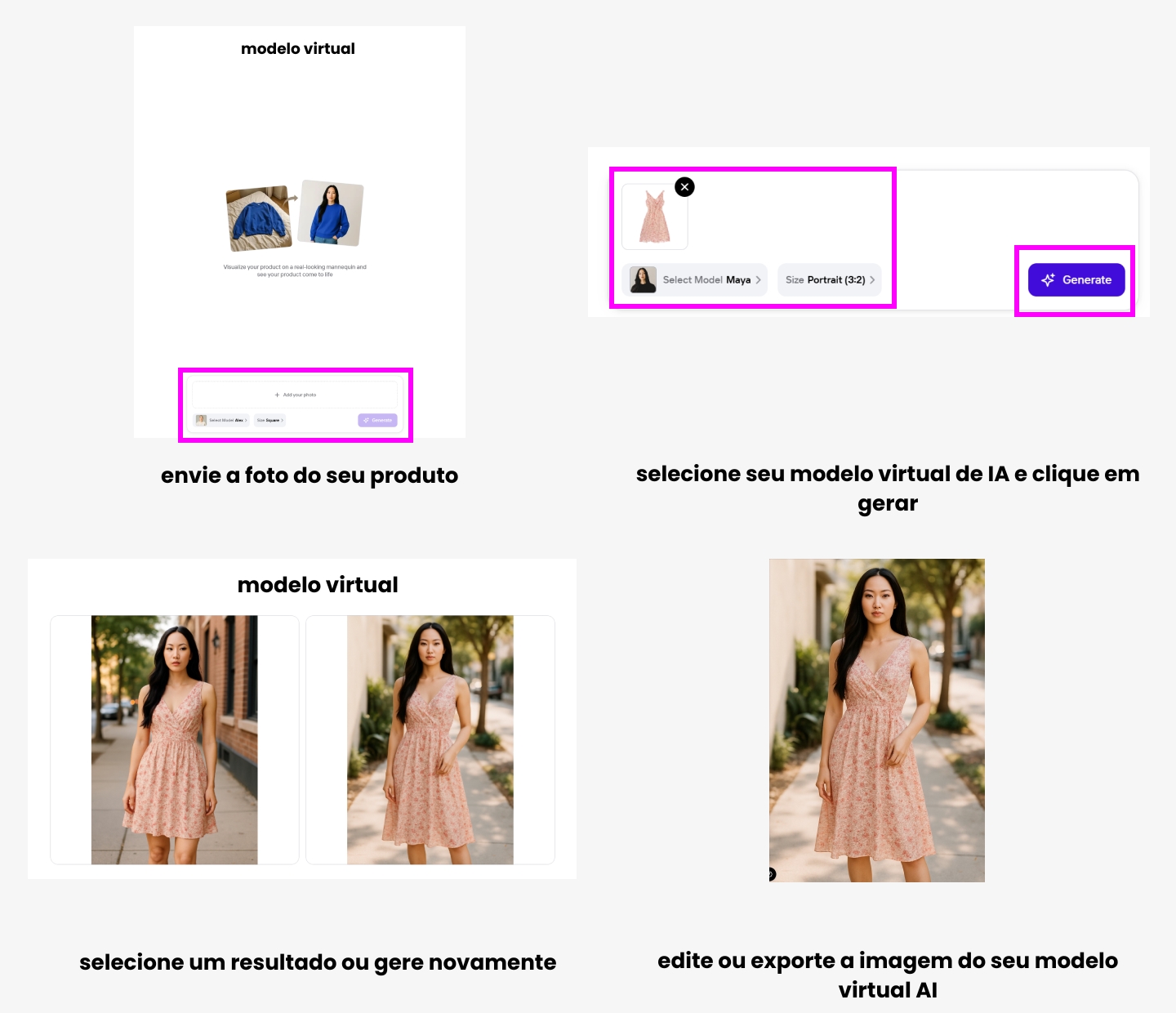 Ferramentas como o Modelo Virtual da Photoroom permitem que o empreendedor produza imagens de moda realistas a partir de fotos planas de produtos. O fluxo de trabalho é simples e pode ser realizado em poucas etapas: