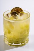 Amasse os ingredientes, complete o copo com gelo e adicione o sake e as folhas de hortelã.