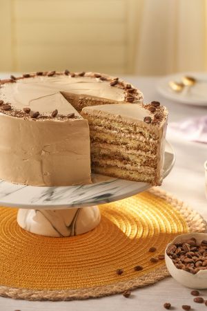 - Com o restante do creme de café, cubra as laterais e topo do bolo. Decore com cacau em pó e grãos de café. Deixe gelar por cerca de 1 hora e sirva a seguir.