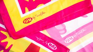 A campanha traz consigo a expertise da Scarf Me, marca brasileira referência de alta tecnologia de estamparia, para entregar um produto premium que une o universo lúdico das balas Fini à sofisticação da moda em acessórios de cetim.