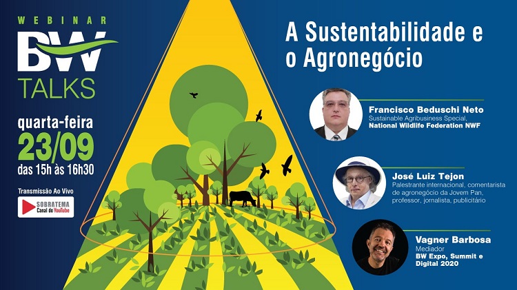 Nesta quarta-feira, dia 23 de setembro, o Webinar BW TALKS recebe dois especialistas no agronegócio para tratar da sustentabilidade nesse setor: o engenheiro agrônomo Francisco Beduschi Neto, especialista em agronegócio sustentável da National Wildlife Federation (NWF), e o professor, apresentador da Jovem Pan e jornalista José Luiz Tejon.