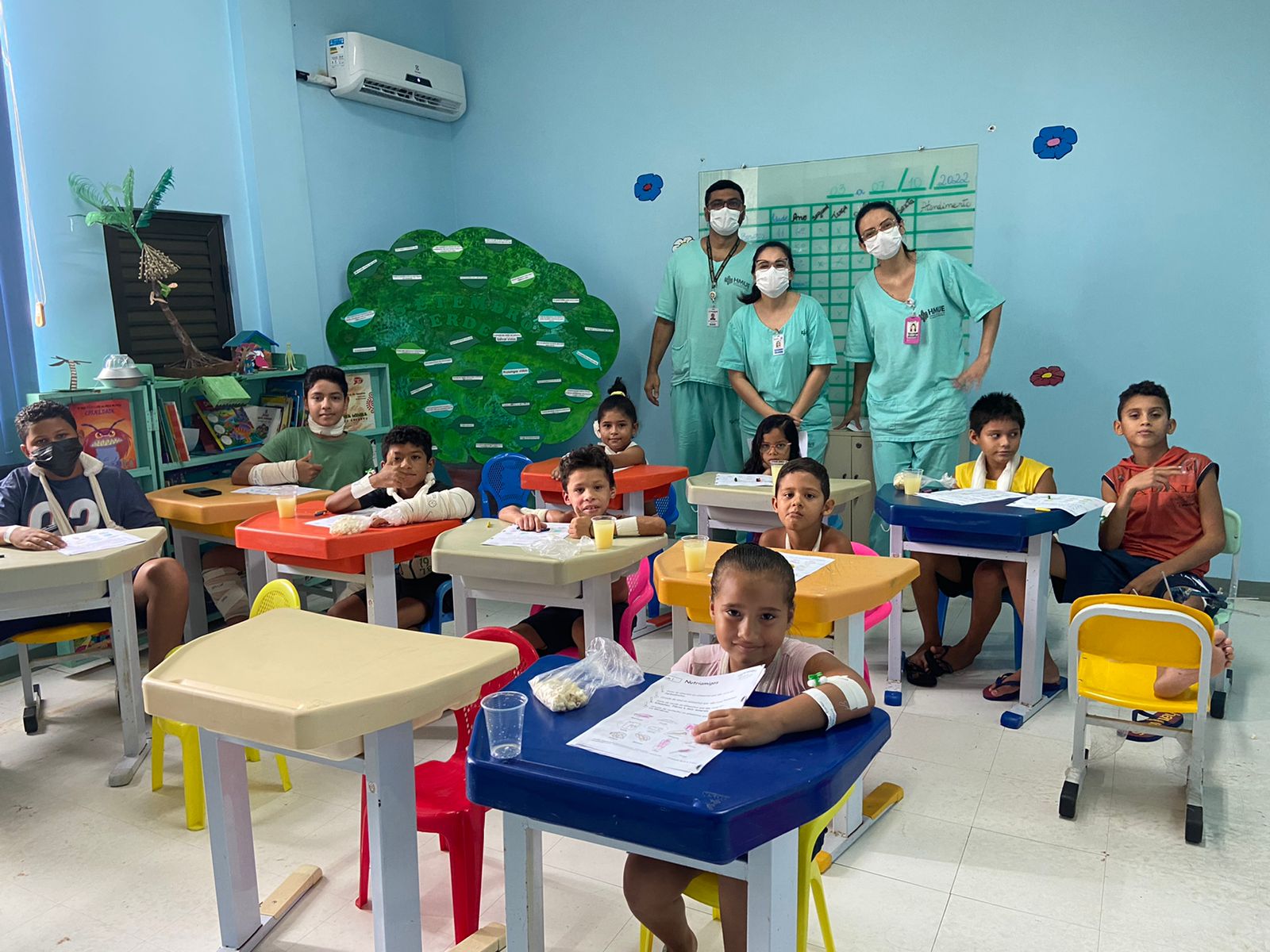 Na classe hospitalar, a aula também foi diferenciada, com a encenação da peça teatral “Princesa Luz e o príncipe Gabriel”, e a realização de jogos educativos de perguntas e respostas.