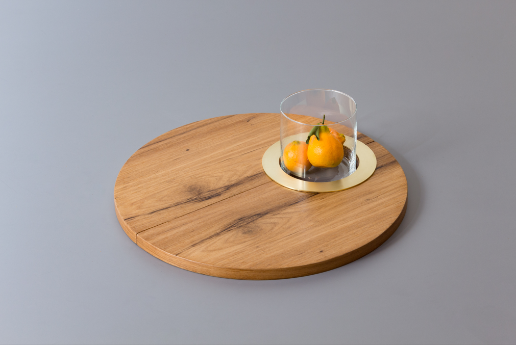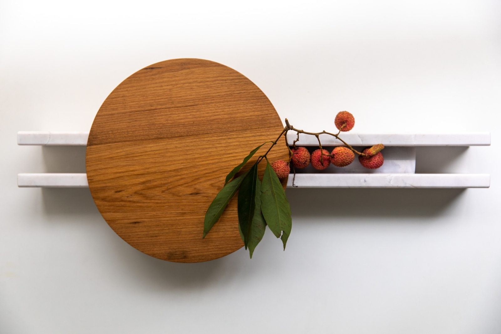 em mármore, em uma linha racional que recebe um prato em madeira. Este