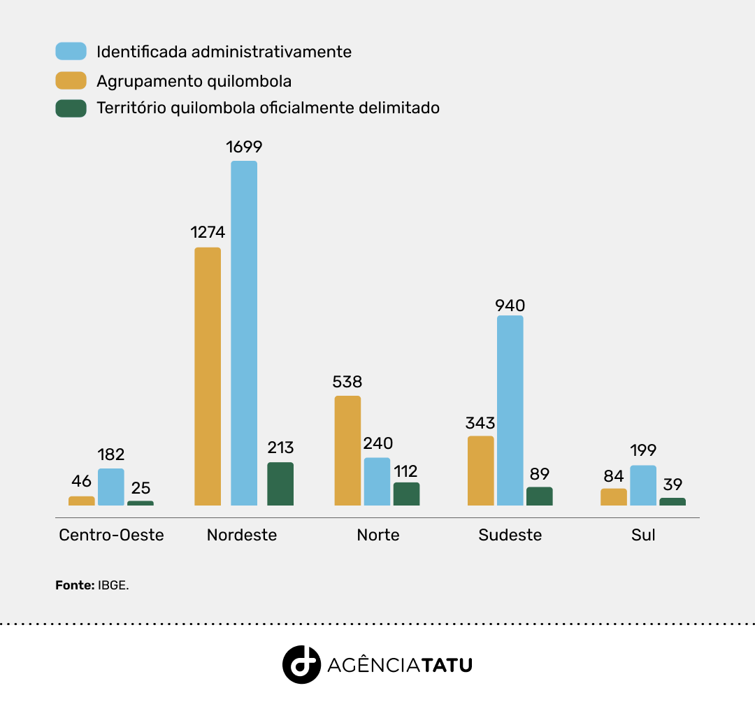 - Apenas 8% das comunidades quilombolas foram oficialmente delimitadas. Sendo que o IBGE classifica