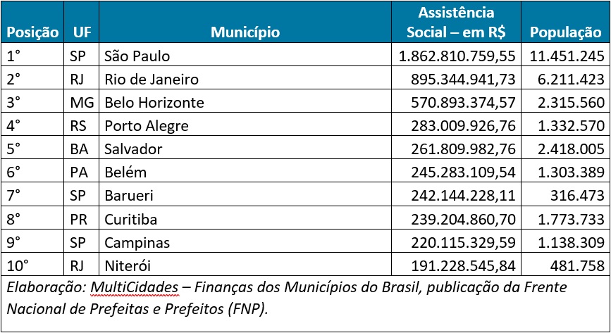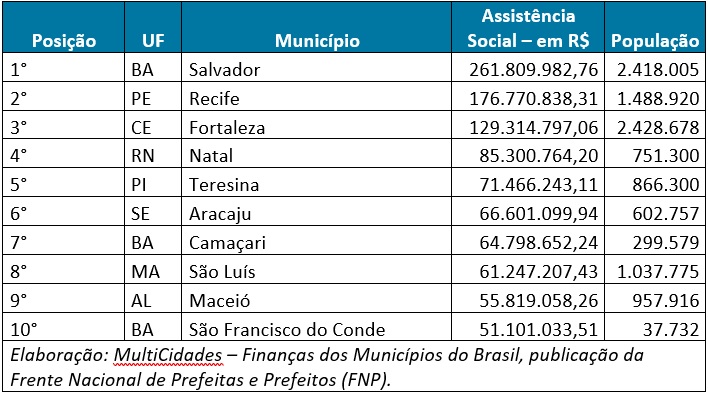 Ranking divulgado pelo anuário MultiCidades – Finanças dos Municípios do Brasil listou as maiores despesas municipais empenhadas com assistência social na Região Nordeste em 2022. Os dados, obtidos em levantamento realizado pela Frente Nacional de Prefeitas e Prefeitos (FNP), mostram que oito capitais estão entre os 10 municípios da lista. Os seis primeiros lugares do ranking são ocupados pelas capitais da região. Salvador (BA) aparece no topo, com R$ 261,8 milhões investidos em assistência social, em 2022. Na sequência estão Recife (PE), com R$ 176,8 milhões; Fortaleza (CE), com R$ 129,3 milhões; Natal (RN), com R$ 85,3 milhões; Teresina (PI), com R$ 71,5 milhões; e Aracaju (SE), com R$ 66,6 milhões. Na sétima posição, o município de Camaçari (BA) surge com R$ 64,8 milhões investidos, seguido por São Luís (MA), com R$ 61,2 milhões e Maceió (AL), com R$ 55,8 milhões. Fechando o ranking, São Francisco do Conde (BA) gastou R$ 51,1 milhões com assistência social em 2022. Realizado pela FNP, o anuário MultiCidades apresenta conteúdo técnico em linguagem amigável e é uma ferramenta de transparência das contas públicas, com dados do desempenho das cidades. A 19ª edição traz ainda um ranking nacional com valores per capita, dados sobre a evolução da pobreza e da extrema pobreza no país, um breve histórico sobre os programas federais Auxílio Brasil e Bolsa Família, além de muitos outros temas. A publicação conta com a consultoria da Aequus e o apoio de Dahua Technology, Febraban, BRB, BYD e Itaú. Consulte o anuário completo em: www.fnp.org.br/publicacoes ou www.aequus.com.br/publicacoes/multi-cidades/. RANKING – AS 10 MAIORES DESPESAS MUNICIPAIS COM ASSISTÊNCIA SOCIAL DA REGIÃO NORDESTE EM 2022 | |