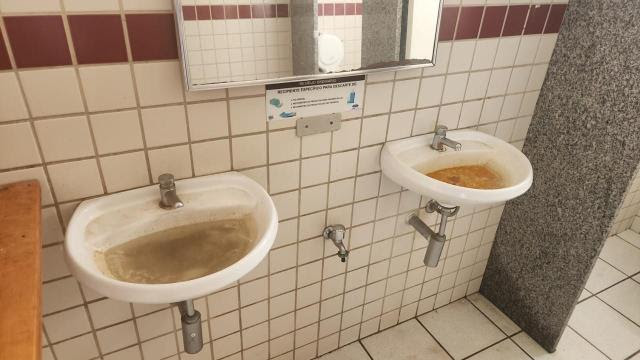 iluminados e sem divisão entre homens e mulheres. Banheiros imundos, sem