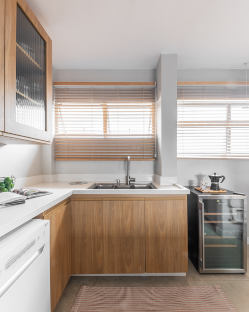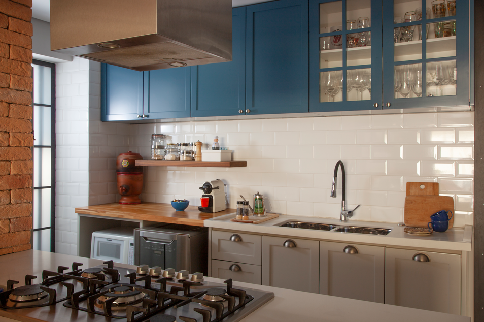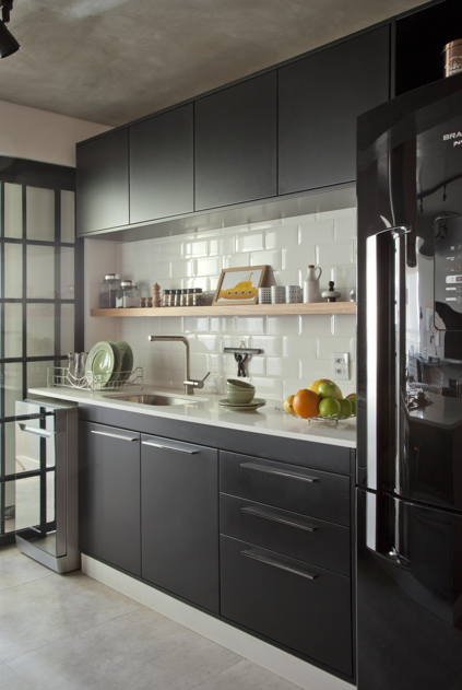 Na cozinha do seu apartamento, o arquiteto Bruno Moraes combinou a especificação de duas cubas de inox com calha úmida | Projeto do BMA Studio | Foto: Guilherme Pucci | |