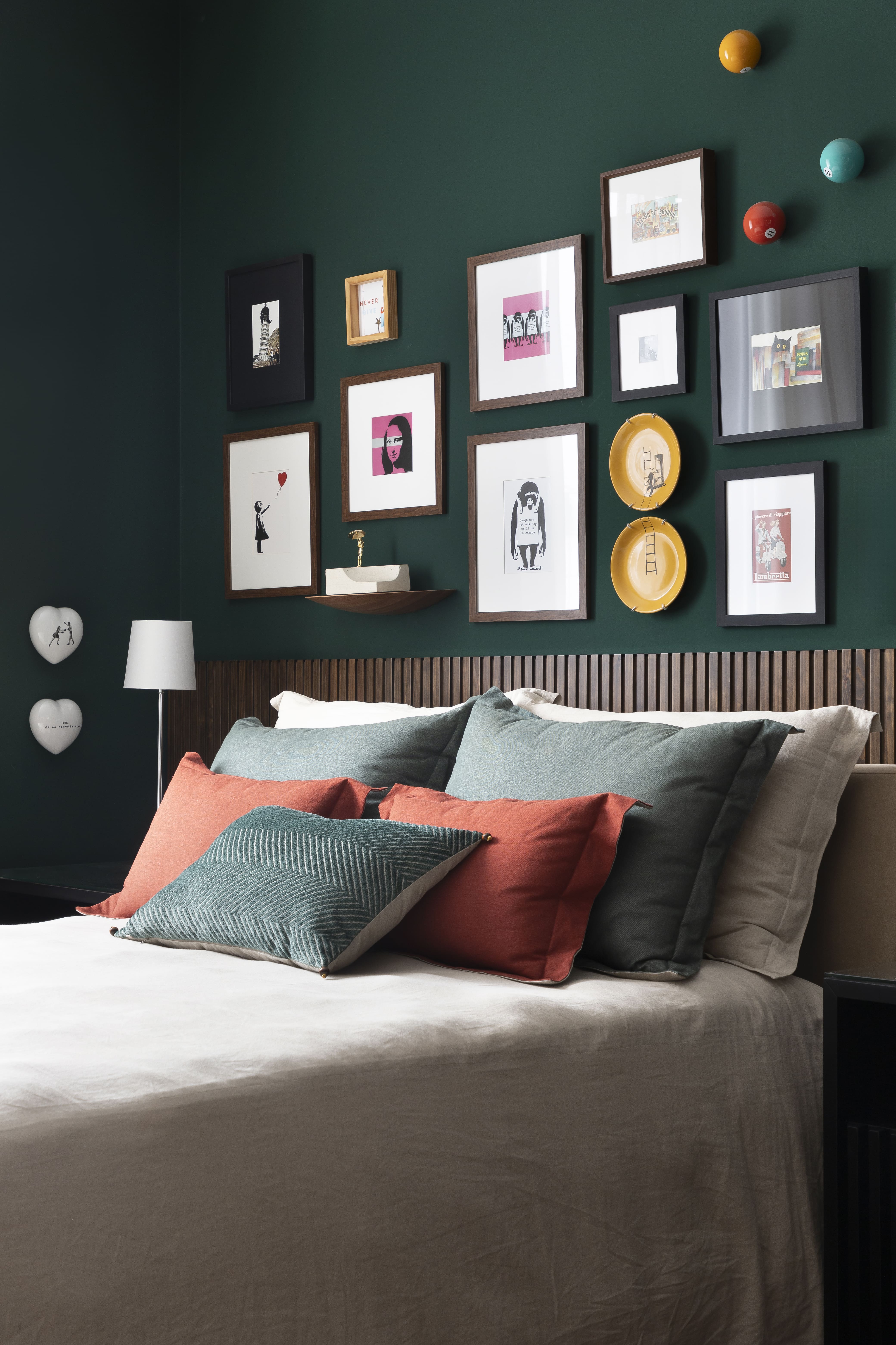 Neste dormitório, o arquiteto Gabriel Figueiredo e o designer de interiores Fabricio Frezza organizaram o gallery wall acima da cabeceira e utilizaram com bossa outros elementos como esculturas e objetos de design autoral | Projeto Frezza e Figueiredo Arquitetura e Design | Foto: Carolina Mossin | |