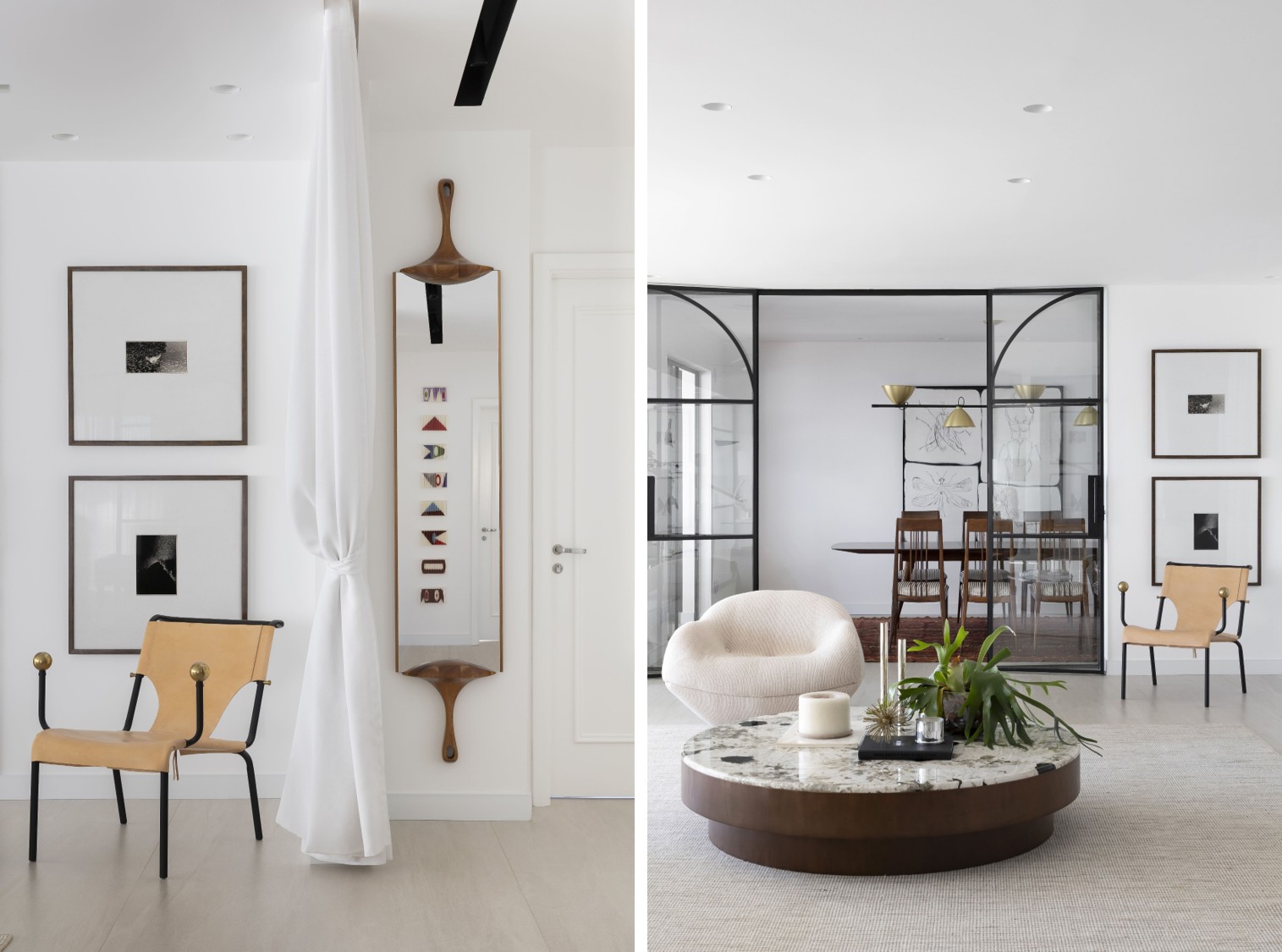 No gallery wall que antecede a sala de jantar, a icônica cadeira Bola de Latão, da arquiteta ítalo-brasileira Lina Bo Bardi | Projeto Frezza e Figueiredo Arquitetura e Interiores | Foto: Carolina Mossin | |