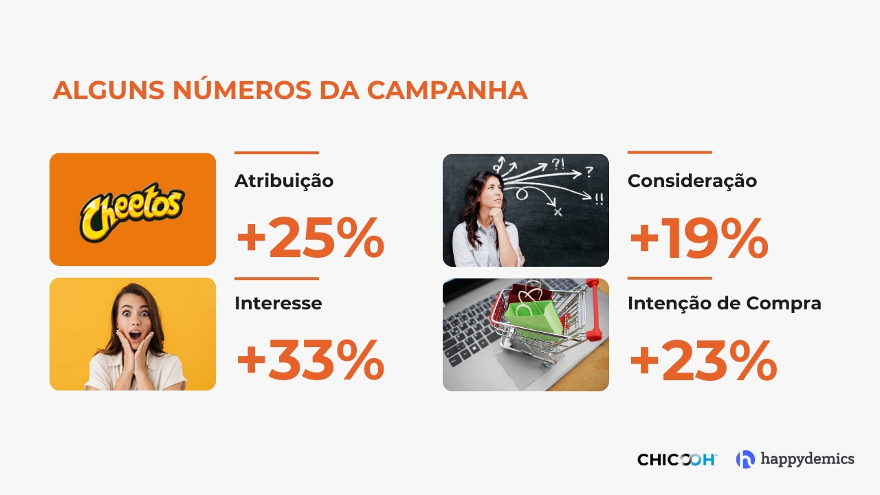 A CHICOOH+, primeira trading desk de OOH e DOOH do Brasil, usou seu serviço de Brand Lift em uma campanha da PepsiCo para a marca Cheetos®, realizada durante o Carnaval de 2025, em Salvador (BA), comprovando a eficácia da mídia exterior com resultados em seu mais recente estudo. Com mais de 1.400.000 inserções, a ação teve como principal objetivo aumentar a visibilidade da marca e mensurar o impacto das ativações de mídia exterior. O estudo identificou o público impactado pela campanha e analisou os indicadores como visibilidade da marca, intenção de compra, engajamento e associação à mensagem criativa.